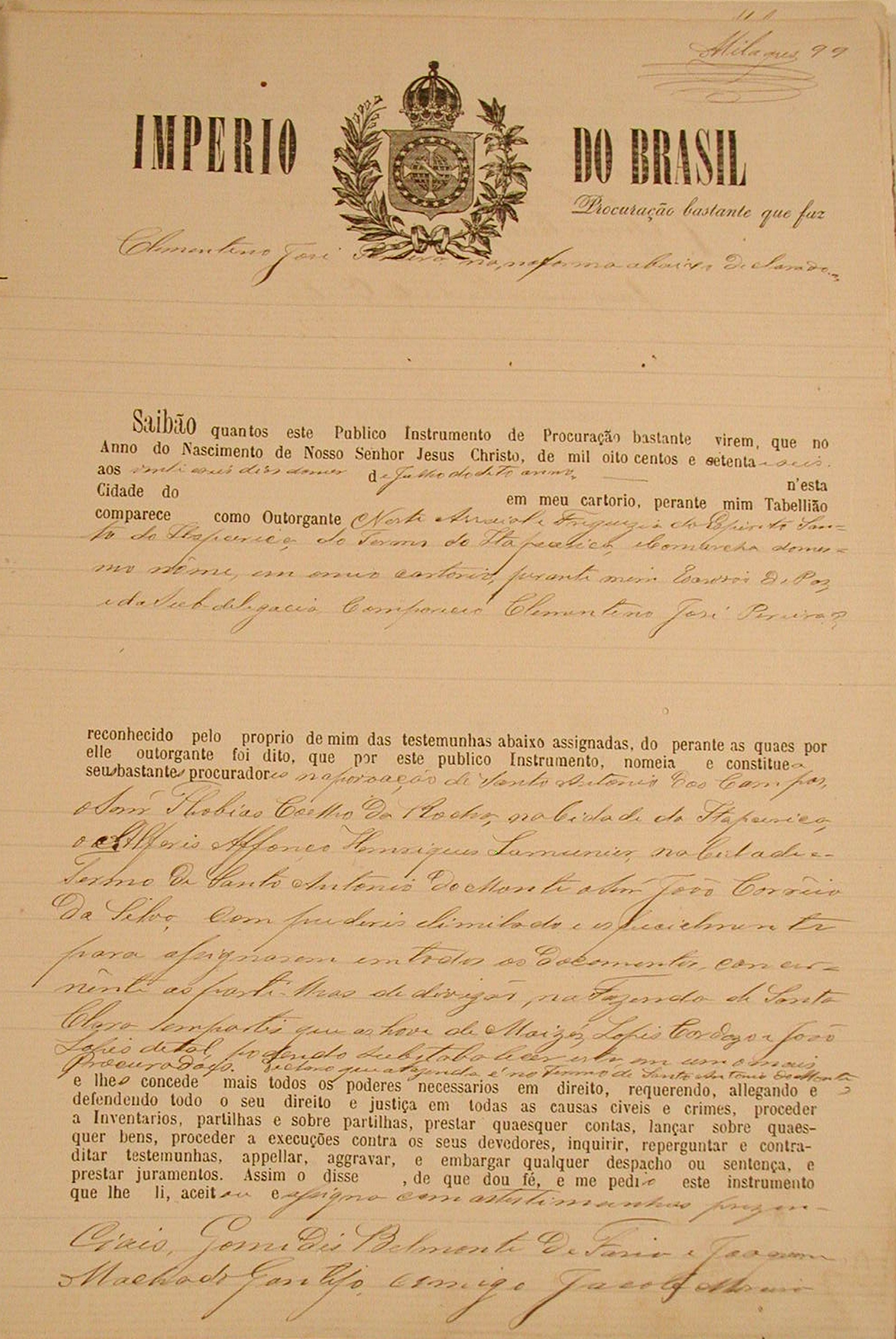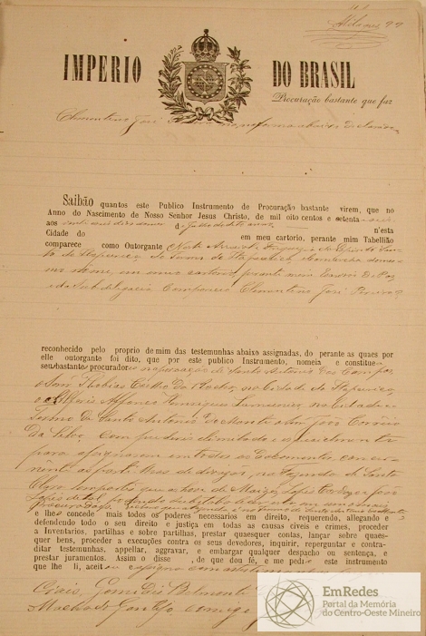 CLEMENTINO JOSÉ PEREIRA, NOMEANDO COMO SEUS PROCURADORES THOBIAS COELHO DA ROCHA, O ALFERES AFONSO HENRIQUES LAMOUNIER E JOÃO CORREIA DA SILVA PARA ASSIGNAR EM TODOS OS DOCUMENTOS CONCERNENTE A PARTILHA DE DIVIDAS, NA FAZENDA DE SANTA CLARA EM PARTES QUE AS HOUVE DE MOÍZES LOPES CARDOZO E JOÃO LOPES DE TAL.