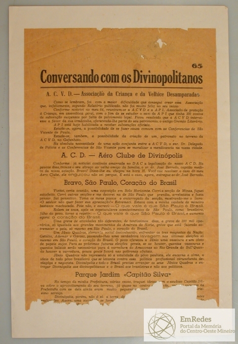 BOLETIM: CONVERSANDO COM OS DIVINOPOLITANOS DE PEDRO X. GONTIJO - ASSUNTO: A C.V.D. - ASSOCIAÇÃO DA CRIANÇA E DA VELHICE DESAMPARADOS.