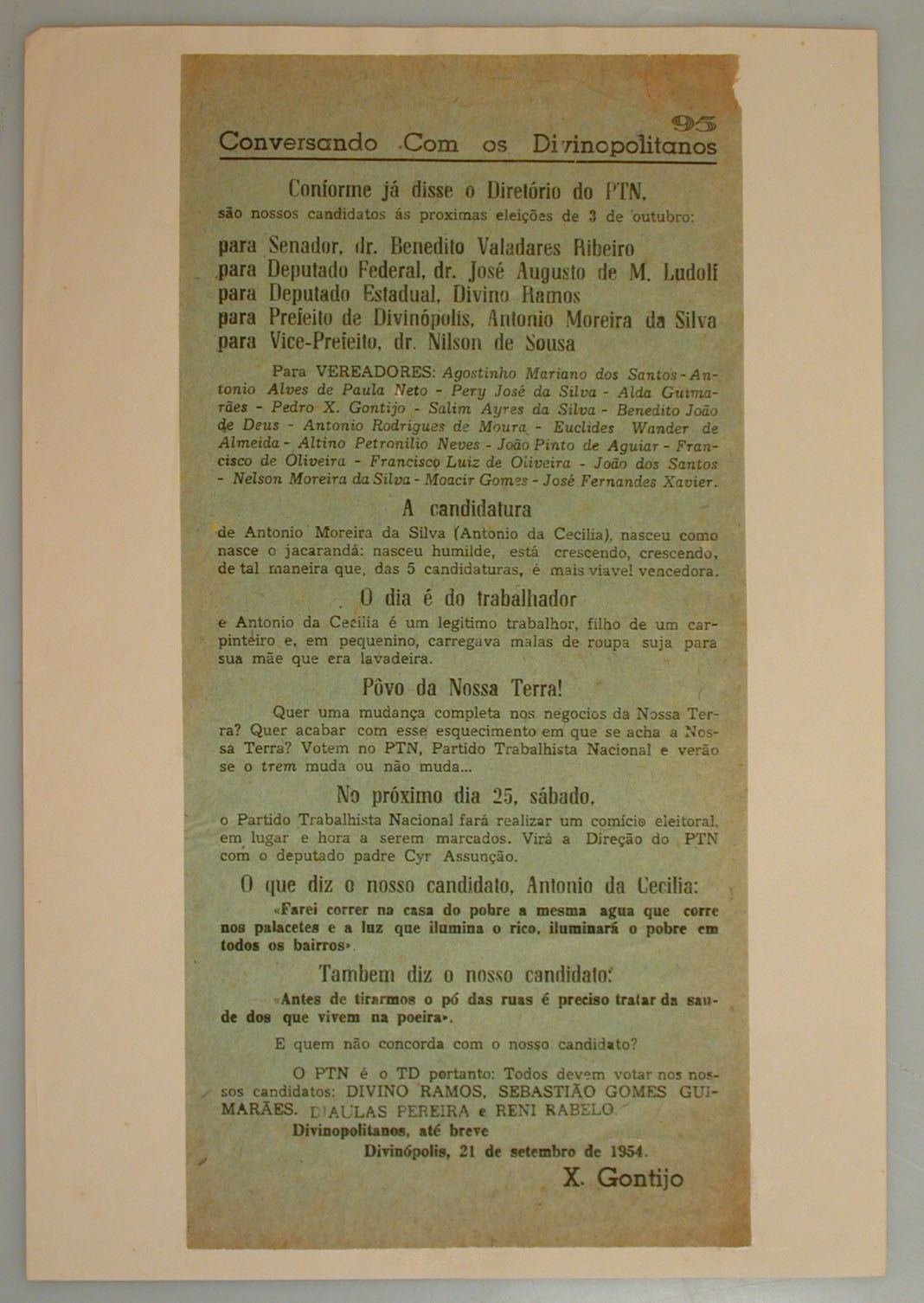 BOLETIM: CONVERSANDO COM OS DIVINOPOLITANOS DE PEDRO X. GONTIJO - ASSUNTO: CONFORME JÁ DISSE O DIRTÓRIO DO PTN. SÃO OS NOSSOS CONDIDATOSO ÁS PRÓXIMAS ELEIÇÕES DE 3 DE OUTUBRO: PARA SENADOR, DR. BENEDITO VALADARES RIBEIRO, PARA DEPUTADO FEDERAL, DR. JOSÉ AUGUSTO DE M. LUDOLF, PARA DEPUTADO ESTADUAL, DIVINO RAMOS, PARA PREFEITO DE DIVINÓPOLIS, ANTONIO MOREIRA DA SILVA, PARA VICE-PREFEITO, DR. NILSON DE SOUSA.