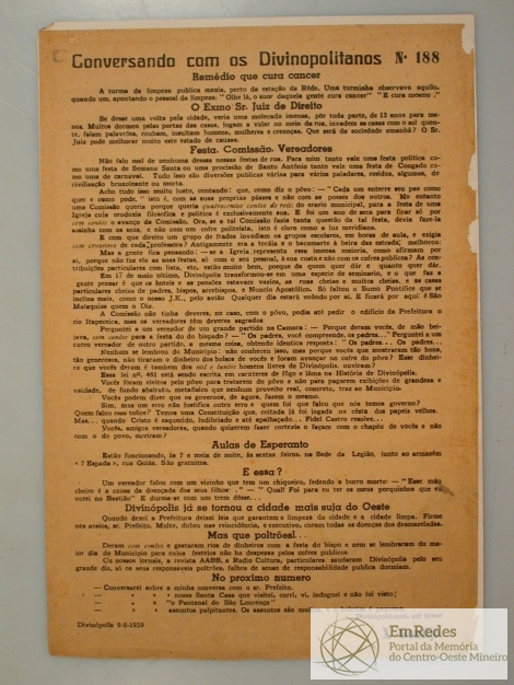 BOLETIM: CONVERSANDO COM OS DIVINOPOLITANOS DE PEDRO X. GONTIJO - ASSUNTOS: REMÉDIO QUE CURA CANCER(SIC) - O EXMO SR. JUIZ DE DIREITO - FESTA. COMISSÃO. VEREADORES - AULAS DE ESPERANTO - E ESSA? - MAS QUE PATRÕES!... - NO PRÓXIMO NÚMERO.
