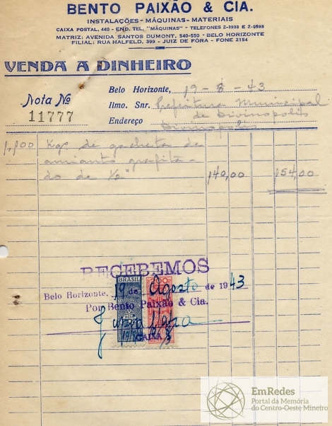 PREFEITURA MUNICIPAL DE DIVINÓPOLIS, 20 DE AGOSTO DE 1943