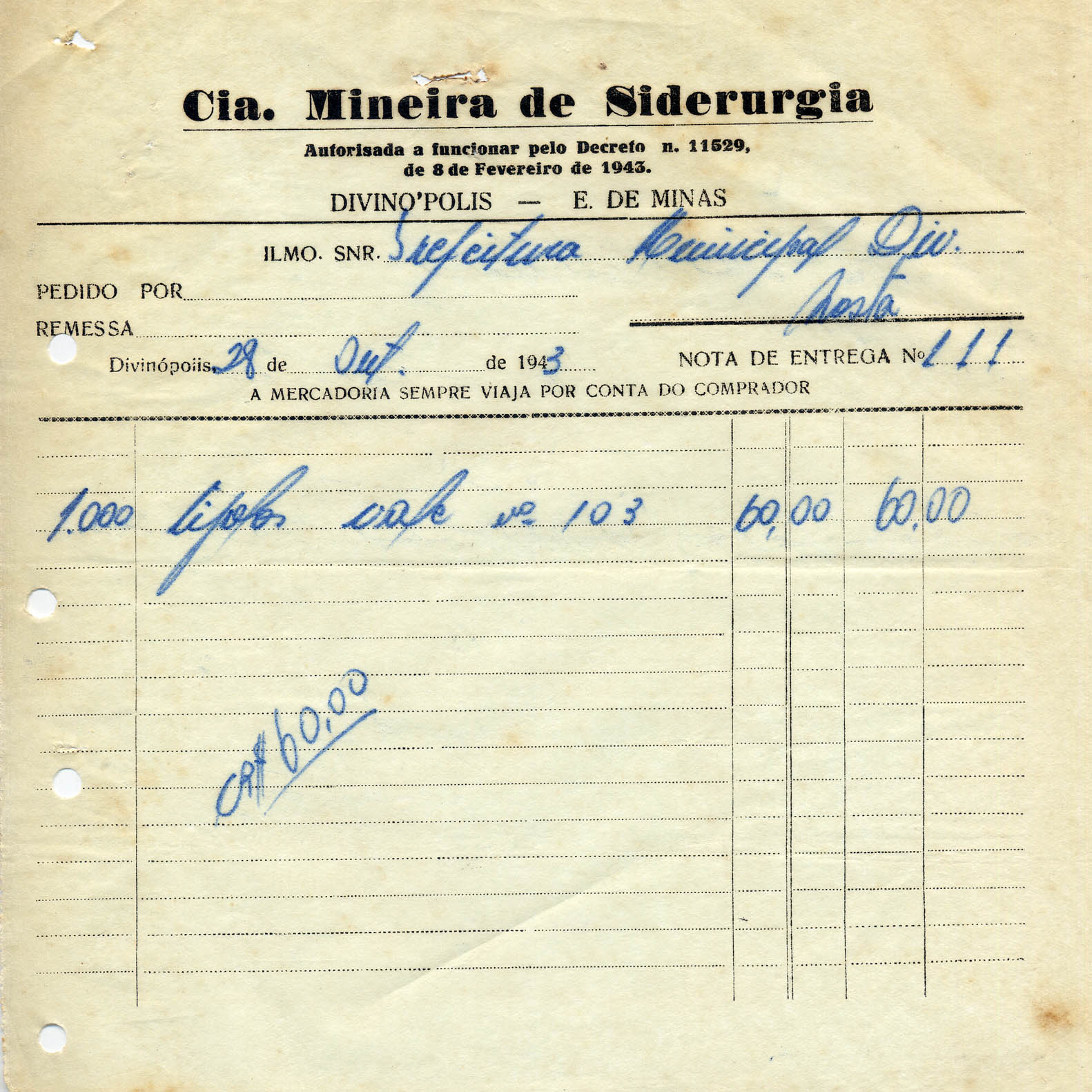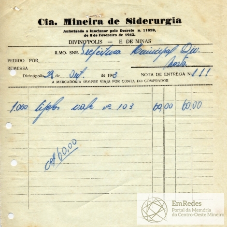PODE O TESOUREIRO PAGAR AO SNR. CIA MINEIRA DE SIDERURUGIA, A QUANTIA DE SESEENTA CRUZEIROS, PROVENIENTE DE 1.000 TIJOLOS.