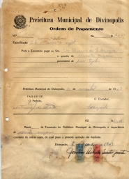 RECEB DA TESOURARIA DA PREFEITURA MUNICIPAL DE DIVINÓPOLIS A IMPORTÂNCIA DE SESSENTA CRUZEIROS CONSTANTE DA ORDEM SUPRA, DA QUAL PASSO A PRESENTE QUITAÇÃO EM DUPLICATA.