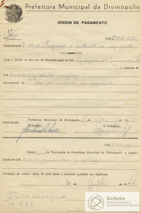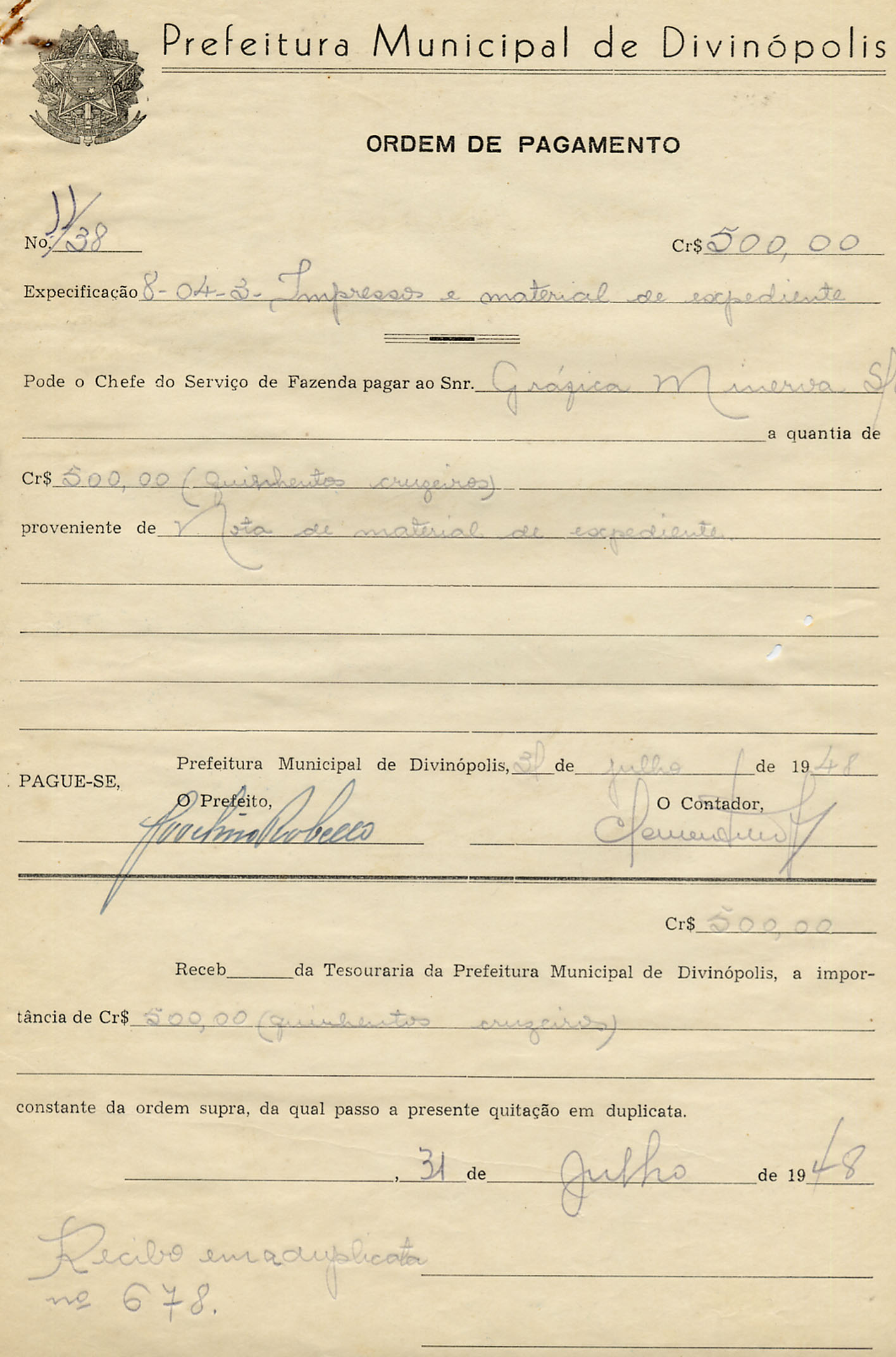RECEB DA TESOURARIA DA PREFEITURA MUNICIPAL DE DIVINÓPOLIS, A IMPORTÂNCIA DE CR$ 500,00(QUINHENTOS CRUZEIROS), CONSTANTE DA ORDEM SUPRA, DA QUAL PASSO A PRESENTE QUITAÇÃO EM DUPLICATA.
