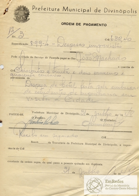 PODE O CHEFE DO SERVIÇO DE FAZENDA PAGAR AO SNR. JOÃO MACHADO, A QUANTIA DE CR$ SEISCENTOS E TRINTA E DOIS CRUZEIROS E QUARENTA CENTAVOS, PROVENIENTE DE DESPESA DE HOTEL FEITA PELA EMBAIXADA DE ESTUDANTES DE ENGENHARIA EM VISITA A CIDADE.