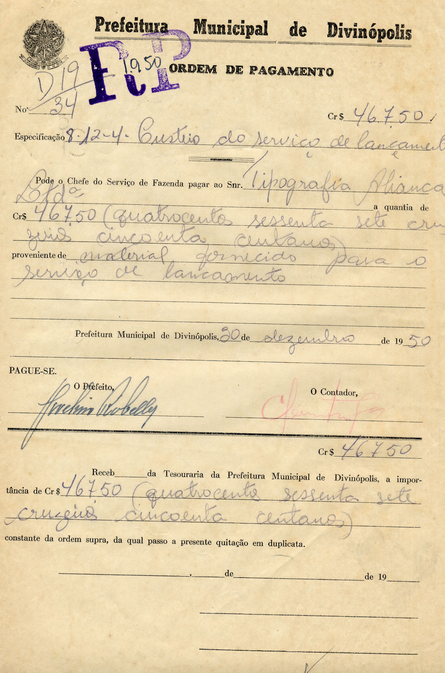 PEDE O CHEFE DO SERVIÇO DE FAZENDA PAGAR AO SNR TIPOGRAFIA ALIANÇA LTDA, A QUANTIA DE CR$ 467,50 (QUATROCENTOS SESSENTA SETE CRUZEIROS CINCOENTA CENTAVOS), PROVENIENTE DE MATERIAL FORNECIDO PARA O SERVIÇO DE LANCAMENTO.