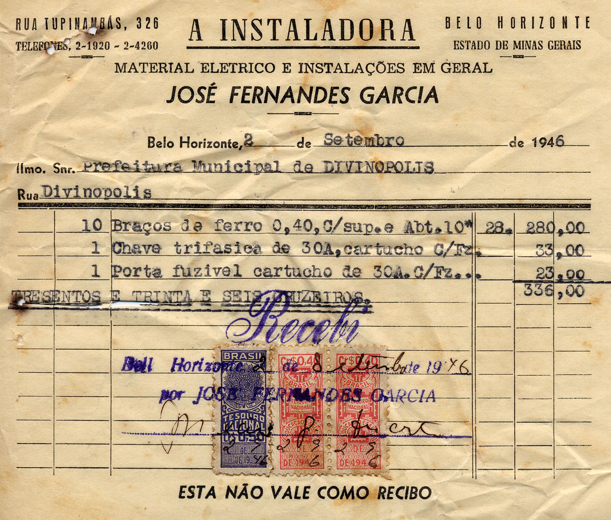 RECEB DA TESOURARIA DA PREFEITURA MUNICIPAL DE DIVINÓPOLIS, A IMPORTÂNCIA DE CR$ TRESENTOS E TRINTA E SEIS CRUZEIROS, CONSTANTE DA ORDEM SUPRA, DA QUAL PASSO A PRESENTE QUITAÇÃO EM DUPLICATA.