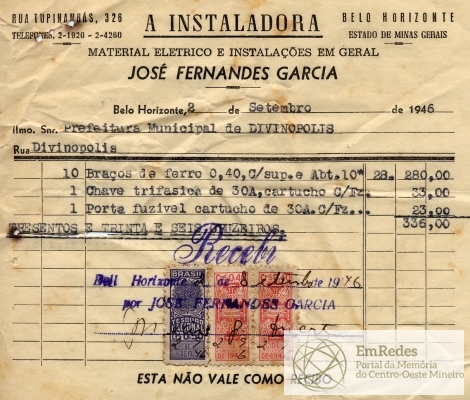 PODE O CHEFE DO SERVIÇO DE FAZENDA PAGAR AO SNR. JOSÉ FERNANDES GARCIA, A QUANTIA DE CR$ TREZENTOS E TRINTA E SEIS CRUZEIROS, PROVENIENTE DE MATERIAL ADQUIRIDO PARA A LUZ DE ERMIDA.