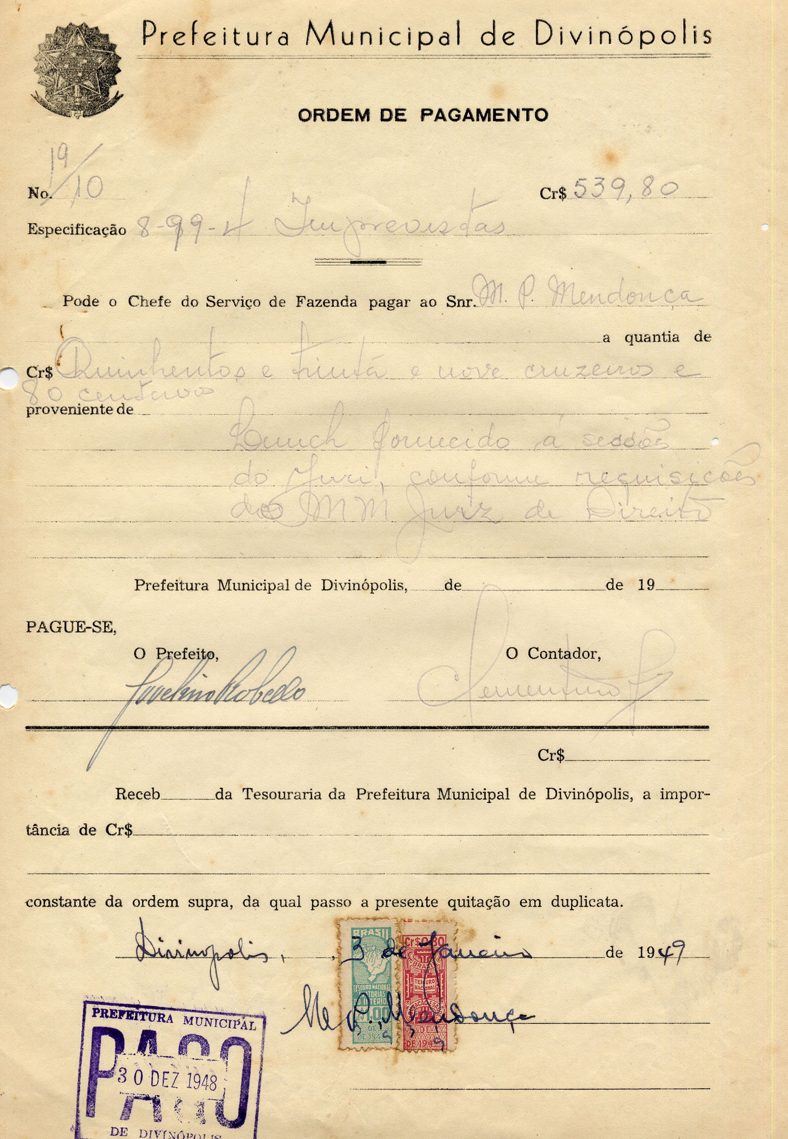PODE O CHEFE DO SERVIÇO DE FAZENDA PAGAR AO SNR. MP MENDONÇA, A QUANTIA DE CR$ QUINHENTOS E TRINTA E NOVE CRUZEIROS E 80 CENTAVOS , PROVENIENTE DE LANCHE FORNECIDO A SESSÕES DO JURI, CONFORME REQUISIÇÕES DOS MM JUIZ DE DIREITO.