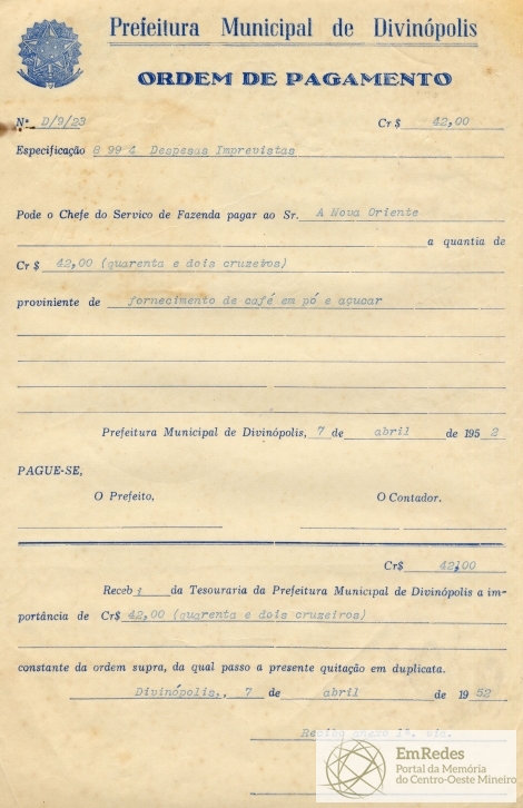 PODE O CHEFE DO SERVIÇO DE FAZENDA PAGAR AO SR A NOVA ORIENTE, A QUANTIA DE CR$ 42,00 (QUARENTA E DOIS CRUZEIROS), PROVENIENTE DE FORNECIMENTO DE CAFÉ EM PÓ E AÇUCAR.
