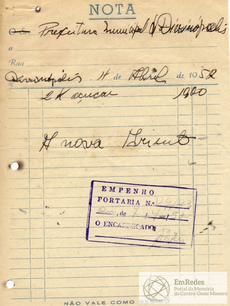 PREFEITURA MUNICIPAL DE DIVINÓPOLIS - ORDEM DE PAGAMENTO Nº D/9/23 CR$ 42,00 ESPECIFICAÇÃO 8 99 4 DESPESAS IMPREVISTAS PODE O CHEFE DO SERVIÇO DE FAZENDA PAGAR AO SR A NOVA ORIENTE, A QUANTIA DE CR$ 42,00 (QUARENTA E DOIS CRUZEIROS), PROVENIENTE DE FORNECIMENTO DE CAFÉ EM PÓ E AÇUCAR. PREFEITURA MUNICIPAL DE DIVINÓPOLIS, 07 DE ABRIL DE 1952 PAGUE-SE O PREFEITO, O CONTADOR, (ESSA ORDEM DE PAGAMENTO NÃO CONTÉM ASSINATURA DOS SRS. PREFEITO E CONTADOR) CR$ 42,00 RECEB DA TESOURARIA DA PREFEITURA MUNICIPAL DE DIVINÓPOLIS A IMPORTÂNCIA DE CR$ 42,00 (QUARENTA E DOIS CRUZEIROS), CONSTANTE DA ORDEM SUPRA, DA QUAL PASSO A PRESENTE QUITAÇÃO EM DUPLICATA. DIVINÓPOLIS, 07 DE ABRIL DE 1952