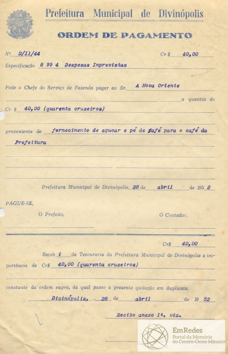 RECEBI DA TESOURARIA DA PREFEITURA MUNICIPAL DE DIVINÓPOLIS A IMPORTÂNCIA DE CR$ 40,00 (QUARENTA CRUZEIROS), CONSTANTE DA ORDEM SUPRA, DA QUAL PASSO A PRESENTE QUITAÇÃO EM DUPLICATA.