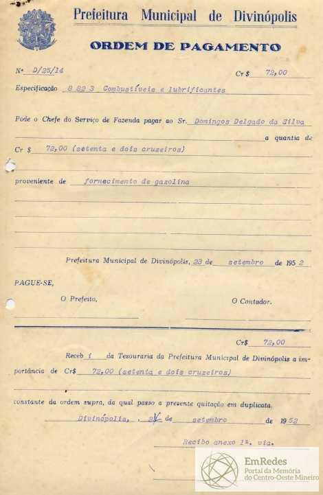RECEBI DA TESOURARIA DA PREFEITURA MUNICIPAL DE DIVINÓPOLIS A IMPORTÂNCIA DE CR$ 72,00 (SETENTA E DOIS CRUZEIROS), CONSTANTE DA ORDEM SUPRA, DA QUAL PASSO A PRESENTE QUITAÇÃO EM DUPLICATA.