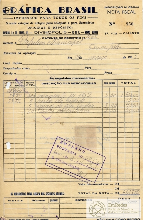 PREFEITURA MUNICIPAL DE DIVINÓPOLIS, 09 DE ABRIL DE 1952