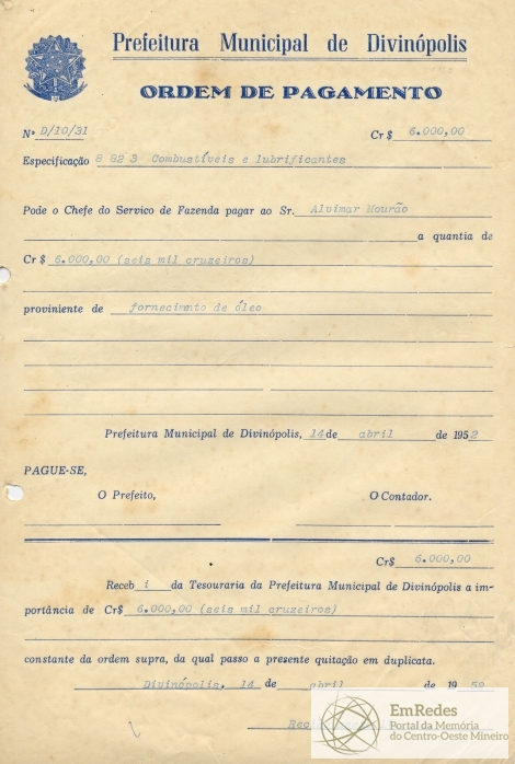 PODE O CHEFE DO SERVIÇO DE FAZENDA PAGAR AO SR. ALVIMAR MOURÃO, A QUANTIA DE CR$ 6.000,00 (SEIS MIL CRUZEIROS), PROVENIENTE DE FORNECIMENTO DE ÓLEO.