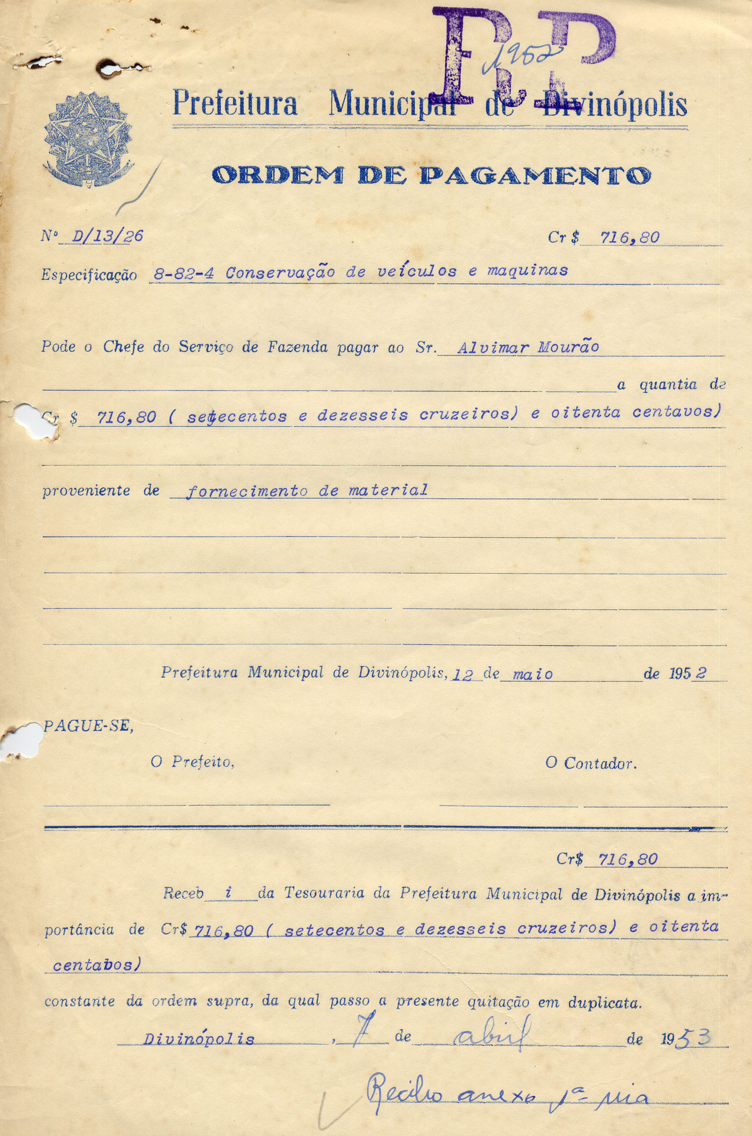 RECEBI DA TESOURARIA DA PREFEITURA MUNICIPAL DE DIVINÓPOLIS A IMPORTÂNCIA DE CR$ 716,80 (SETECENTOS E DEZESSEIS CRUZEIROS E OITENTA CENTAVOS) CONSTANTE DA ORDEM SUPRA, DA QUAL PASSO A PRESENTE QUITAÇÃO EM DUPLICATA.