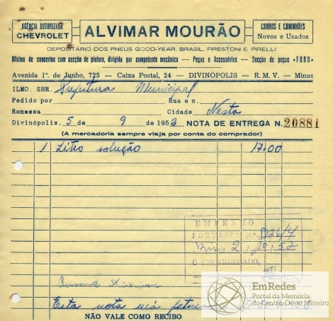 PREFEITURA MUNICIPAL DE DIVINÓPOLIS - ORDEM PAGAMENTO Nº D/26/4 CR$ 907,50 ESPECIFICAÇÃO 8 82 4 CONSERVAÇÃO DE VEÍCULOS E MÁQUINAS PODE O CHEFE DO SERVIÇO DE FAZENDA PAGAR AO SR.ALVIMAR MOURÃO, A QUANTIA DE CR$ 907,50 (NOVECENTOS E SETE CRUZEIROS E CINCOENTA CENTAVOS), PROVENIENTE DE FORNECIMENTO DE MATERIAL E CONSERTOS, FATURA Nº 7846. PREFEITURA MUNICIPAL DE DIVINÓPOLIS, 02 DE OUTUBRO DE 1952 CR$ 907,50 RECEBI DA TESOURARIA DA PREFEITURA MUNICIPAL DE DIVINÓPOLIS A IMPORTÂNCIA DE CR$ 907,50 (NOVECENTOS E SETE CRUZEIROS E CINCOENTA CENTAVOS) CONSTANTE DA ORDEM SUPRA, DA QUAL PASSO A PRESENTE QUITAÇÃO EM DUPLICATA. DIVINÓPOLIS, 07 DE ABRIL DE 1953