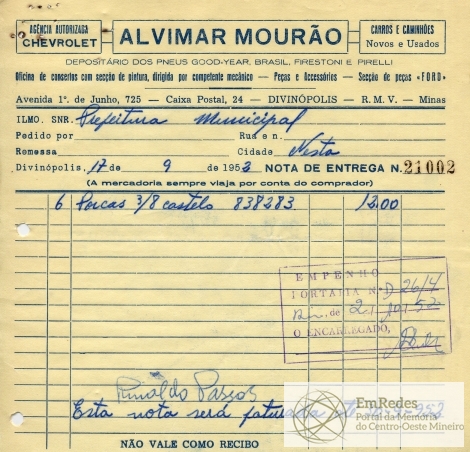 PREFEITURA MUNICIPAL DE DIVINÓPOLIS - ORDEM PAGAMENTO Nº D/26/4 CR$ 907,50 ESPECIFICAÇÃO 8 82 4 CONSERVAÇÃO DE VEÍCULOS E MÁQUINAS PODE O CHEFE DO SERVIÇO DE FAZENDA PAGAR AO SR.ALVIMAR MOURÃO, A QUANTIA DE CR$ 907,50 (NOVECENTOS E SETE CRUZEIROS E CINCOENTA CENTAVOS), PROVENIENTE DE FORNECIMENTO DE MATERIAL E CONSERTOS, FATURA Nº 7846. PREFEITURA MUNICIPAL DE DIVINÓPOLIS, 02 DE OUTUBRO DE 1952 CR$ 907,50 RECEBI DA TESOURARIA DA PREFEITURA MUNICIPAL DE DIVINÓPOLIS A IMPORTÂNCIA DE CR$ 907,50 (NOVECENTOS E SETE CRUZEIROS E CINCOENTA CENTAVOS) CONSTANTE DA ORDEM SUPRA, DA QUAL PASSO A PRESENTE QUITAÇÃO EM DUPLICATA. DIVINÓPOLIS, 07 DE ABRIL DE 1953