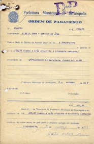 RECEBI DA TESOURARIA DA PREFEITURA MUNICIPAL DE DIVINÓPOLIS A IMPORTÂNCIA DE CR$ 103,50 (CENTO E TRÊS CRUZEIROS E CINCOENTA CENTAVOS) CONSTANTE DA ORDEM SUPRA, DA QUAL PASSO A PRESENTE QUITAÇÃO EM DUPLICATA.