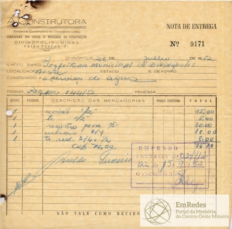 A CONSTRUTORA CR$ 397,00 DUPLICATA E FATURA 2.614 PREFEITURA MUNICIPAL DE DIVINÓPOLIS, 30 DE SETEMBRO DE 1952