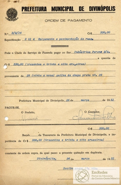 PREFEITURA MUNICIPAL DE DIVINÓPOLIS, 26 DE MARÇO DE 1951