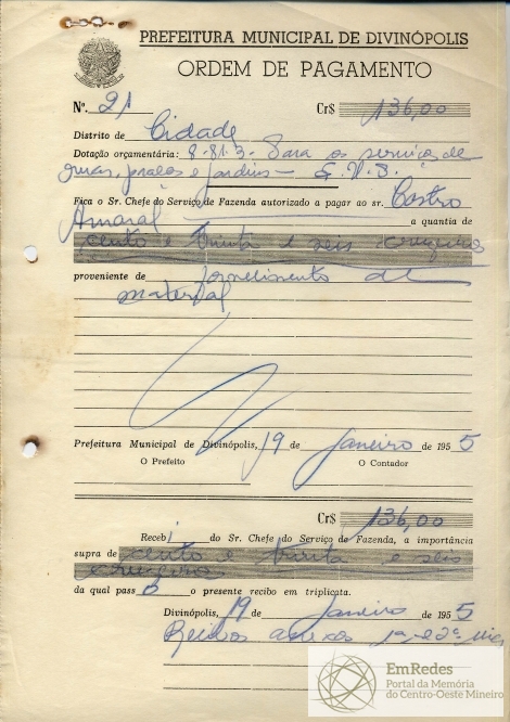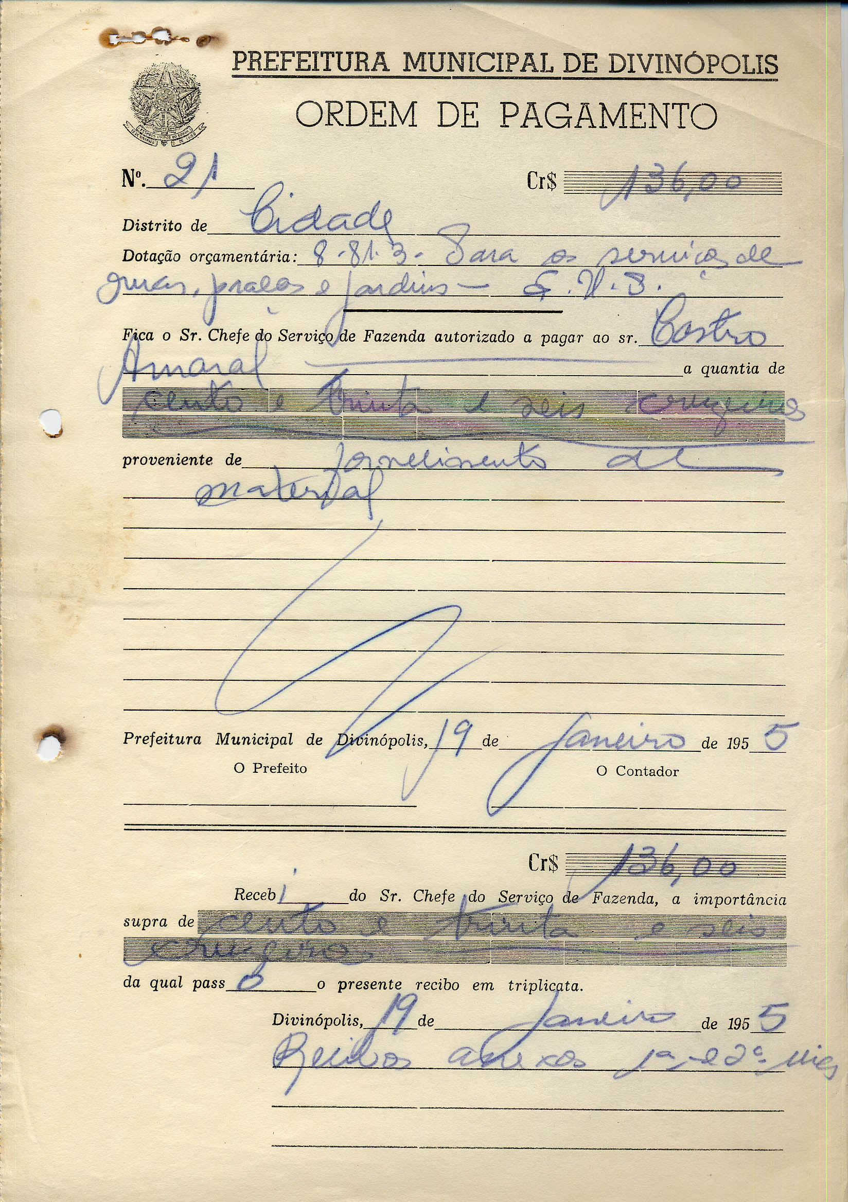 RECEBI DO SR. CHEFE DO SERVIÇO DE FAZENDA, A IMPORTÂNCIA SUPRA DE CENTO E TRINTA E SEIS CRUZEIROS, DA QUAL PASSO PRESENTE RECIBO EM TRIPLICATA.