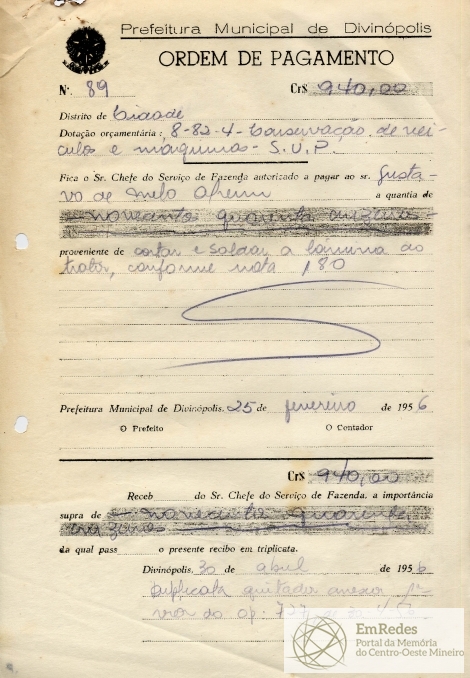 PREFEITURA MUNICIPAL DE DIVINÓPOLIS, 25 DE FEVEREIRO DE 1956