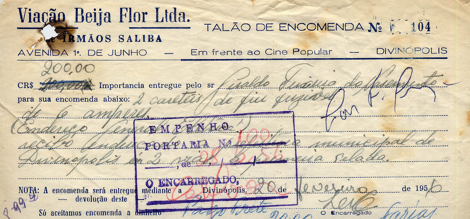 FICA O SR. CHEFE DO SERVIÇO DE FAZENDA AUTORIZADO A PAGAR AO SR. IRMÃOS SALIBA, A QUANTIA DE VINTE CRUZEIROS, PROVENIENTE DE FRETE S/ DOIS CARRETEIS DE FIO RECOZIDO.