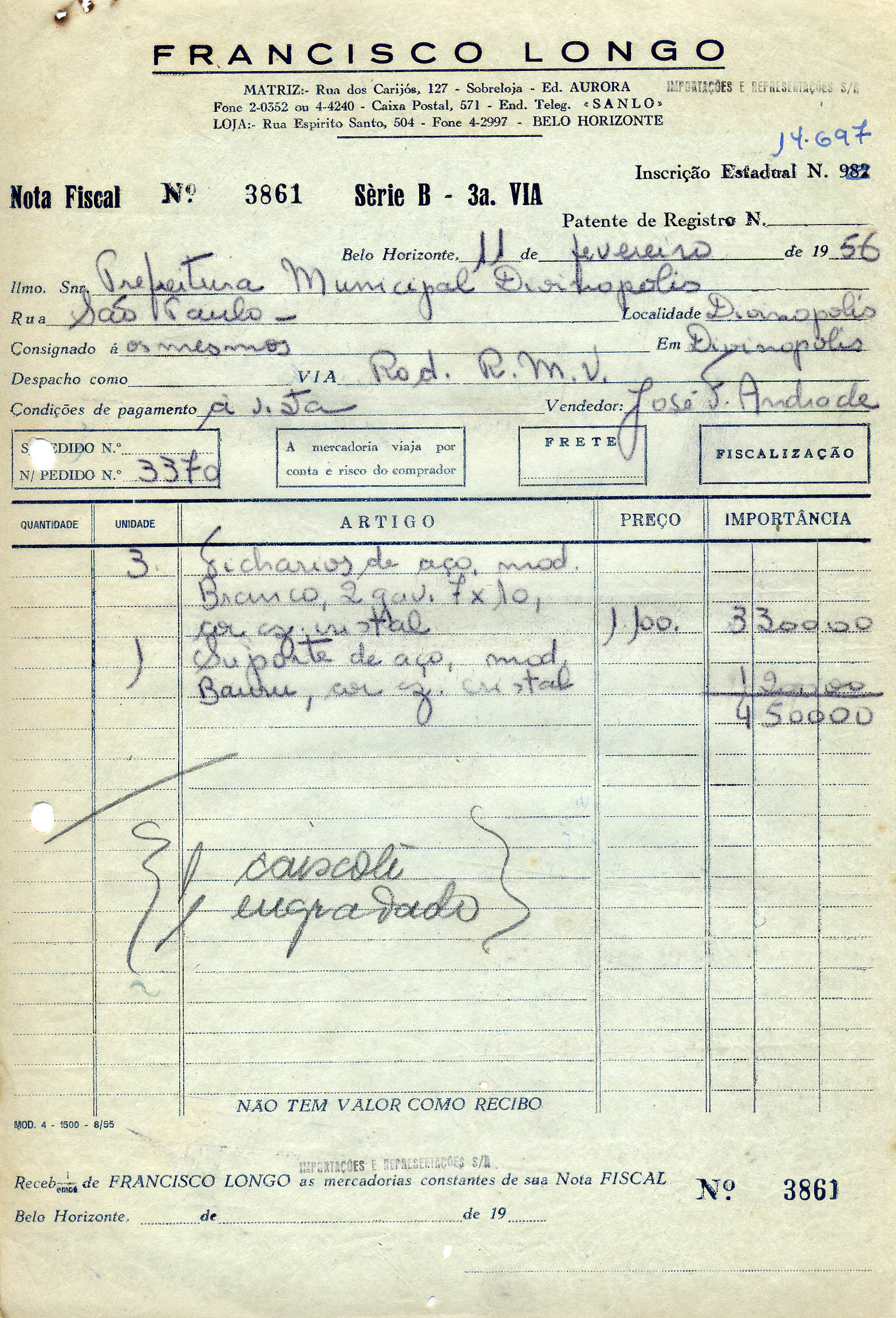 FICA O SR. CHEFE DO SERVIÇO DE FAZENDA AUTORIZADO A PAGAR AO SR. FRANCISCO LOMBO IMPORTAÇÕES E REPRESENTAÇÕES S/A, A QUANTIA DE QUATRO MIL E QUINHENTOS CRUZEIROS, PROVENIENTE DE 3 FICHÁRIOS DE AÇO E 1 SUPORTE AÇO, FATURA Nº 059.
