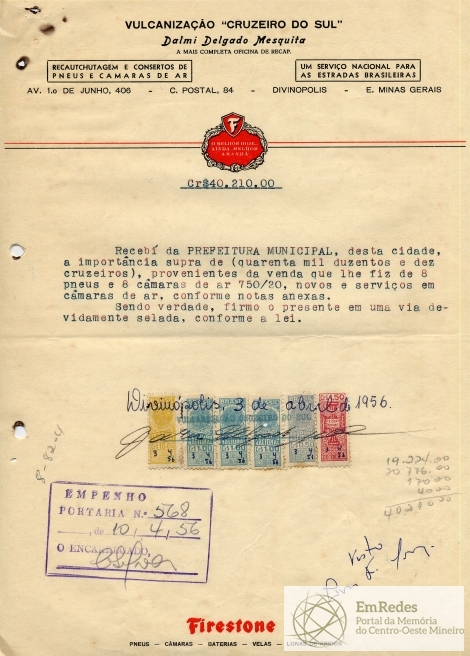 FICA O SR. CHEFE DO SERVIÇO DE FAZENDA AUTORIZADO A PAGAR AO SR. DALMI DELGADO MESQUITA, A QUANTIA DE QUARENTA MIL DUZENTOS E DEZ CRUZEIROS, PROVENIENTE DE 8 PNEUS E 8 CÂMARAS DE AR.