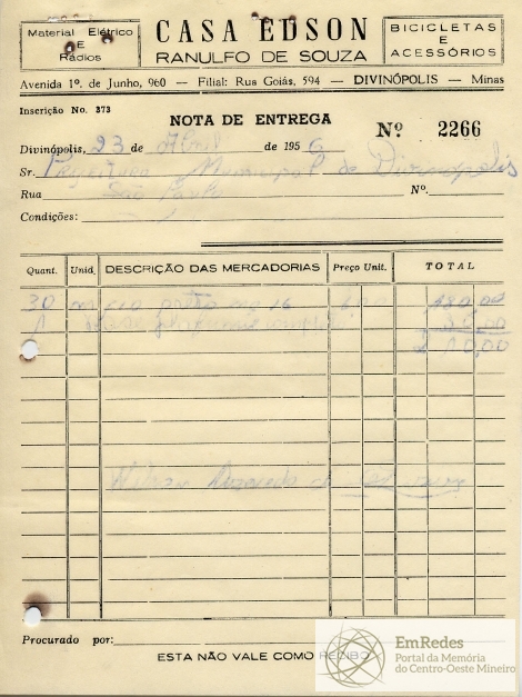 PREFEITURA MUNICIPAL DE DIVINÓPOLIS - ORDEM DE PAGAMENTO Nº 666 CR$ 1.228,00 DISTRITO DE CIDADE DOTAÇÃO ORÇAMENTÁRIA 8-63-3 MATERIAL PARA O SERVIÇO DE AGUA, SERVIÇOS INDUSTRIAIS FICA O SR. CHEFE DO SERVIÇO DE FAZENDA AUTORIZADO A PAGAR AO SR. RANULFO DE SOUSA, A QUANTIA DE UM MIL, DUZENTOS VINTE OITO CRUZEIROS, PROVENIENTE DE MATERIAIS FORNECIDOS NOTAS 2204, 2218, 2226, 2236, 2259 E 2266. PREFEITURA MUNICIPAL DE DIVINÓPOLIS, 30 DE ABRIL DE 1956 CR$ 1.228,00 RECEBI DO SR. CHEFE DO SERVIÇO DE FAZENDA, A IMPORTÂNCIA SUPRA DE UM MIL, DUZENTOS MIL OITO CRUZEIROS DA QUAL PASSO O PRESENTE RECIBO EM TRIPLICATA. DIVINÓPOLIS, 30 DE ABRIL DE 1956