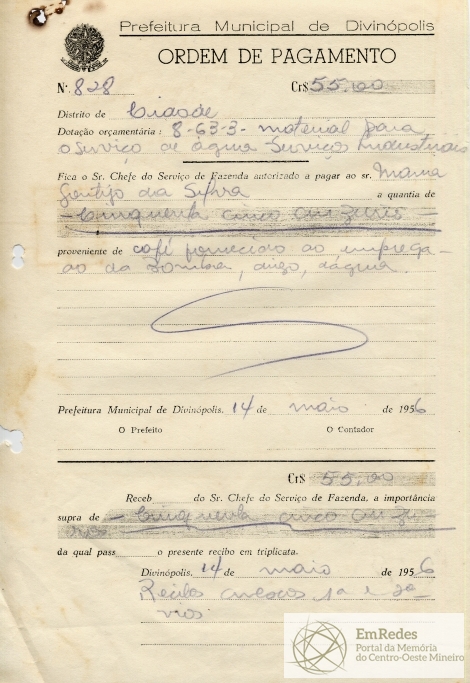 RECEBI DO SR. CHEFE DO SERVIÇO DE FAZENDA, A IMPORTÂNCIA SUPRA DE CINQUENTA E CINCO CRUZEIROS DA QUAL PASSO O PRESENTE RECIBO EM TRIPLICATA.