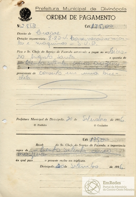 RECEBI DO SR. CHEFE DO SERVIÇO DE FAZENDA, A IMPORTÂNCIA SUPRA DE CENTO E SETENTA CINCO CRUZEIROS DA QUAL PASSO O PRESENTE RECIBO EM TRIPLICATA.