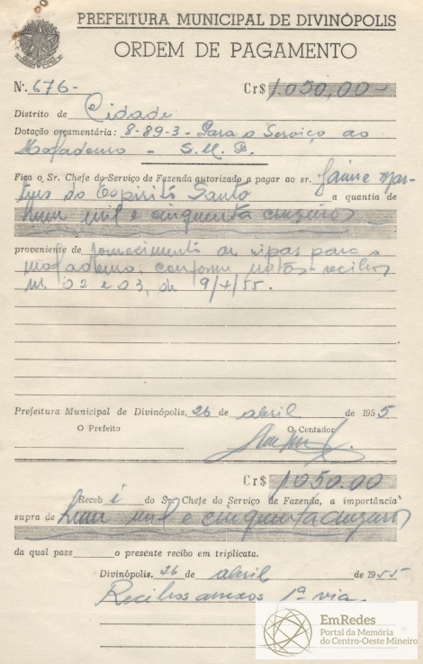PREFEITURA MUNICIPAL DE DIVINÓPOLIS- ORDEM DE PAGAMENTO Nº 676 CR$ 1.050,00 DISTRITO DE CIDADE DOTAÇÃO ORÇAMENTÁRIA 8-89-3 PARA O SERVIÇO AO MATADOURO FICA O SR. CHEFE DO SERVIÇO DE FAZENDA AUTORIAZADO A PAGAR AO SR. JAIME MARTINS DO ESPIRITO SANTO, A QUANTIA DE HUM MIL E CINQUENTA CRUZEIROS, PROVENIENTE DE FORNECIMENTO DE RIPAS PARA O MATADOUTO, CONFORME NOTAS-RECIBOS 02 E 03, DE 09/04/55. PREFEITURA MUNICIPAL DE DIVINÓPOLIS, 26 DE ABRIL DE 1955 CR$ 1.050,00 RECEBI DO SR. CHEFE DO SERVIÇO DE FAZENDA, A IMPORTÂNCIA SUPRA DE HUM MIL E CINQUENTA CRUZEIROS DA QUAL PASSO O PRESENTE RECIBO EM TRIPLICATA. DIVINÓPOLIS, 26 DE ABRIL DE 1955