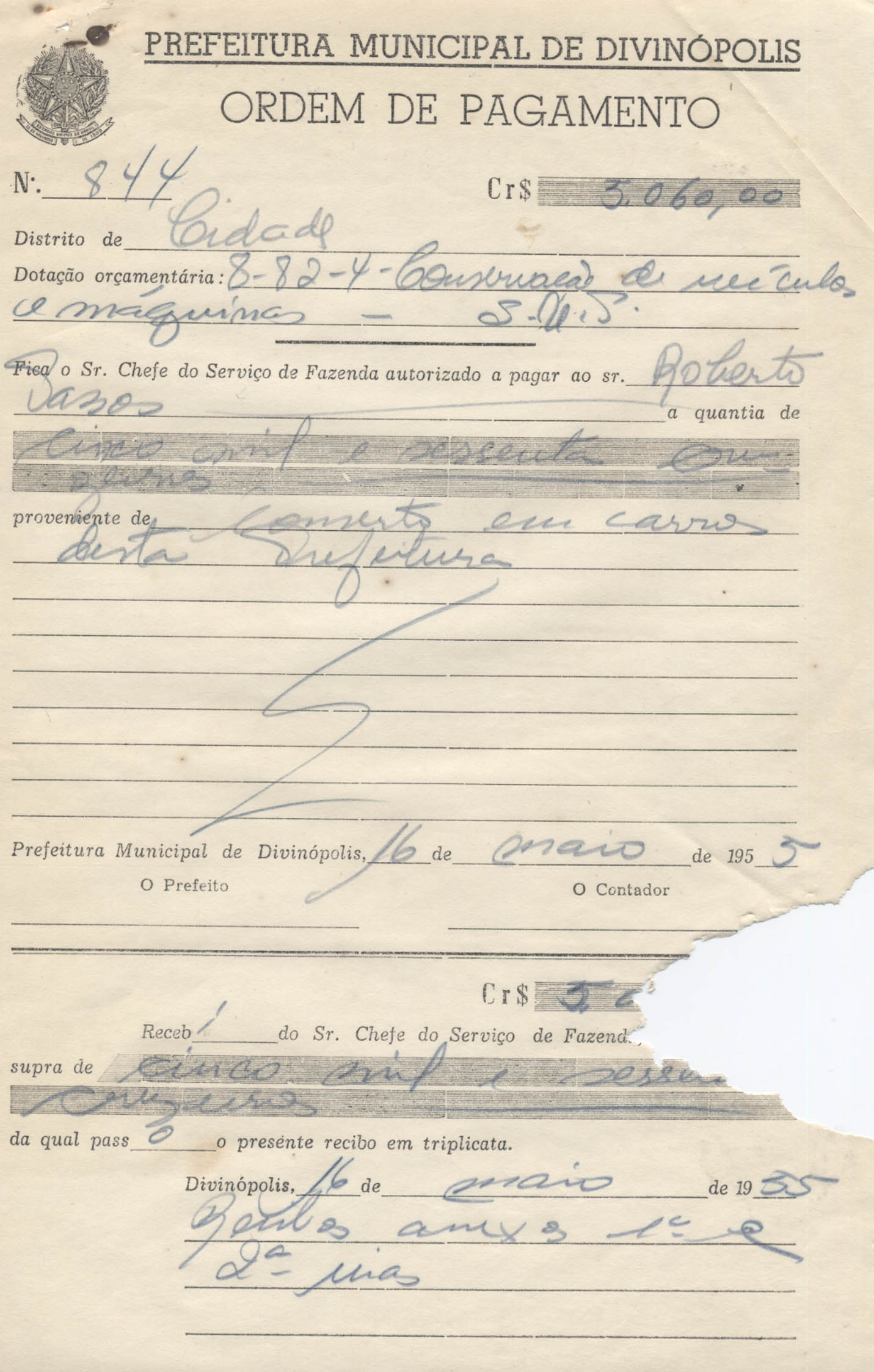 RECEBI DO SR. CHEFE DO SERVIÇO DE FAZENDA, A IMPORTÂNCIA SUPRA DE CINCO MIL E SESSENTA CRUZEIROS DA QUAL PASSO O PRESENTE RECIBO EM TRIPLICATA.