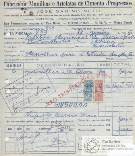 RECEBI DO SR. CHEFE DO SERVIÇO DE FAZENDA, A IMPORTÂNCIA SUPRA DE QUINHNENTOS CRUZEIROS DA QUAL PASSO O PRESENTE RECIBO EM TRIPLICATA.