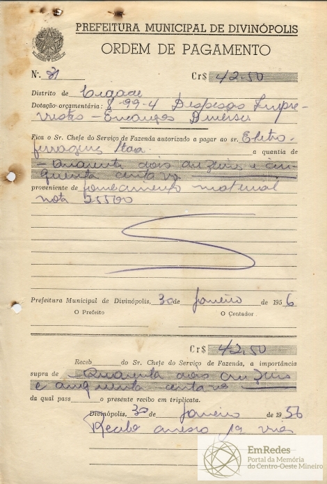 RECEBI DO SR. CHEFE DO SERVIÇO DE FAZENDA, A IMPORTÂNCIA SUPRA DE QUARENTA E DOIS CRUZEIROS DA QUAL PASSO O PRESENTE RECIBO EM TRIPLICATA.