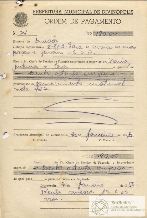 RECEBI DO SR. CHEFE DO SERVIÇO DE FAZENDA, A IMPORTÂNCIA SUPRA DE CENTO E OITENTA CRUZEIROS DA QUAL PASSO O PRESENTE RECIBO EM TRIPLICATA.