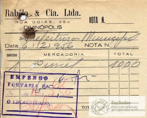 PREFEITURA MUNICIPAL DE DIVINÓPOLIS - ORDEM DE PAGAMENTO Nº 68 CR$ 10,00 DISTRITO DE CIDADE DOTAÇÃO ORÇAMENTÁRIA 8-99-4 DESPESAS IMPREVISTAS, ENCARGOS DIVERSOS FICA O SR. CHEFE DO SERVIÇO DE FAZENDA AUTORIZADO A PAGAR AO SR. RABELO E CIA LTDA, A QUANTIA DE DEZ CRUZEIROS PROVENIENTE DE 1 PINCEL. PREFEITURA MUNICIPAL DE DIVINÓPOLIS, 16 DE FEVEREIRO DE 1956 CR$ 10,00 RECEBI DO SR. CHEFE DO SERVIÇO DE FAZENDA, A IMPORTÂNCIA SUPRA DE DEZ CRUZEIROS DA QUAL PASSO O PRESENTE RECIBO EM TRIPLICATA. DIVINÓPOLIS, 16 DE FEVEREIRO DE 1956