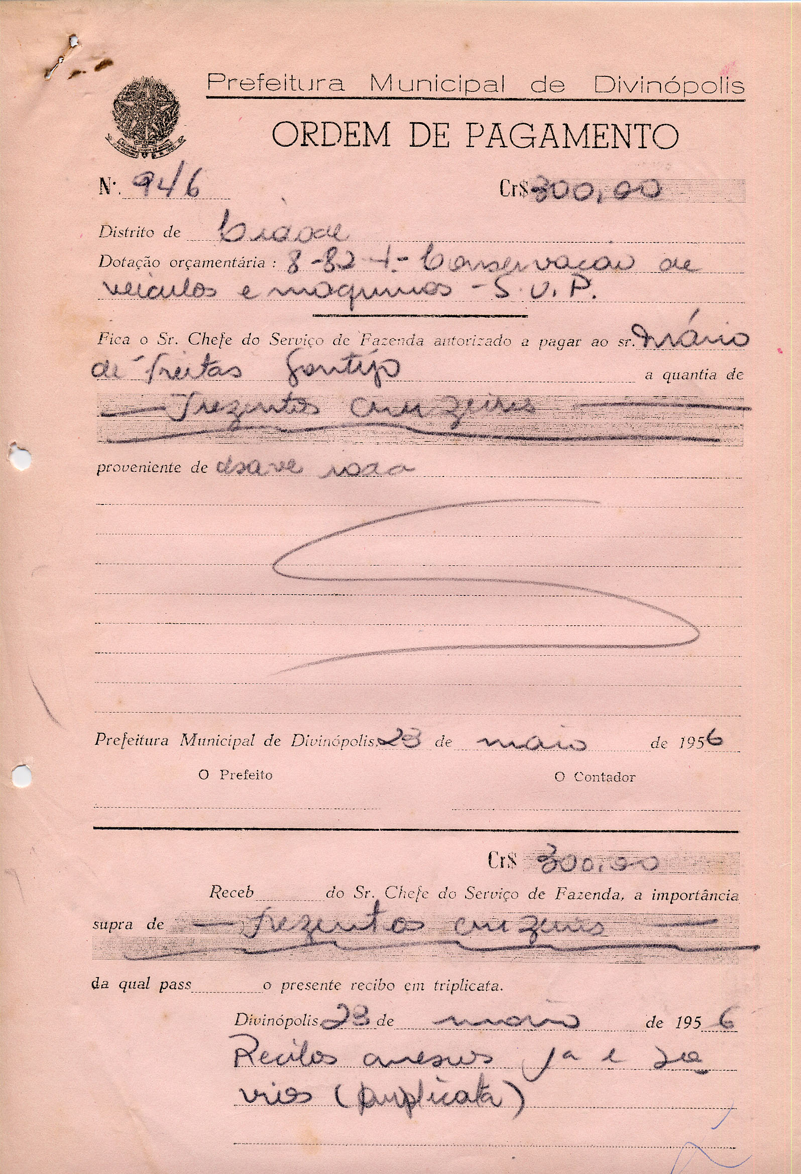 RECEBI DO SR. CHEFE DO SERVIÇO DE FAZENDA, A IMPORTÂNCIA SUPRA DE TREZENTOS CRUZEIROS DA QUAL PASSO O PRESENTE RECIBO EM TRIPLICATA.
