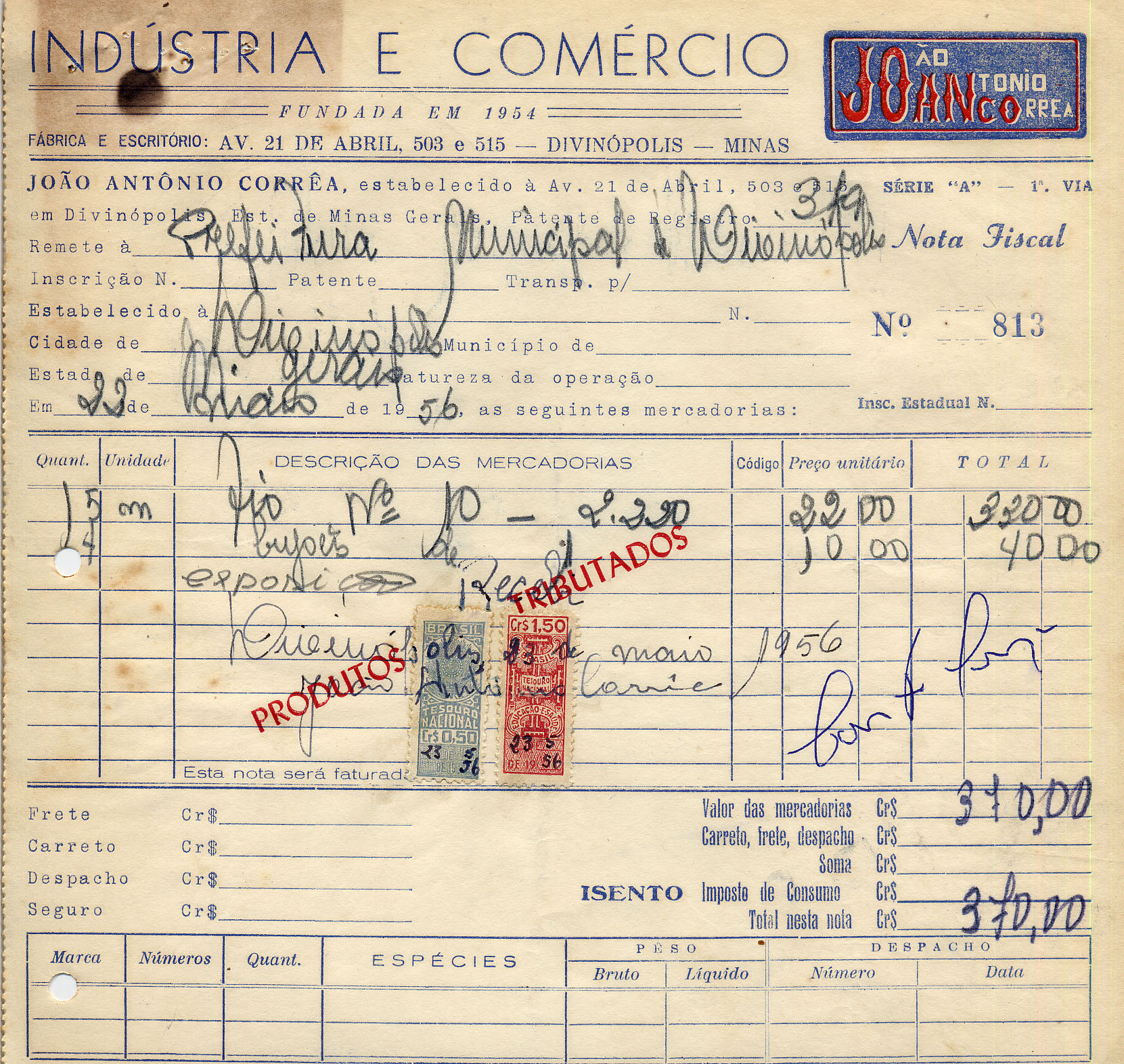 PREFEITURA MUNICIPAL DE DIVINÓPOLIS - ORDEM DE PAGAMENTO Nº 966 CR$ 1103,00 DISTRITO DE CIDADE DOTAÇÃO ORÇAMENTÁRIA 8-81-3 PARA OS SERVIÇOS DE RUAS, PRAÇAS E JARDINS FICA O SR. CHEFE DO SERVIÇO DE FAZENDA AUTORIZADO A PAGAR AO SR. JOÃO ANTÔNIO CORREA, A QUANTIA DE UM MIL CENTO E TREIS CRUZEIROS PROVENIENTE DE MATERIAL FORNECIDO NOTAS 811, 812 E 813. PREFEITURA MUNICIPAL DE DIVINÓPOLIS, 23 DE MAIO DE 1956 CR$ 1.103,00 RECEBI DO SR. CHEFE DO SERVIÇO DE FAZENDA, A IMPORTÂNCIA SUPRA DE UM MIL CENTO E TREIS CRUZEIROS DA QUAL PASSO O PRESENTE RECIBO EM TRIPLICATA. DIVINÓPOLIS, 23 DE MAIO DE 1956