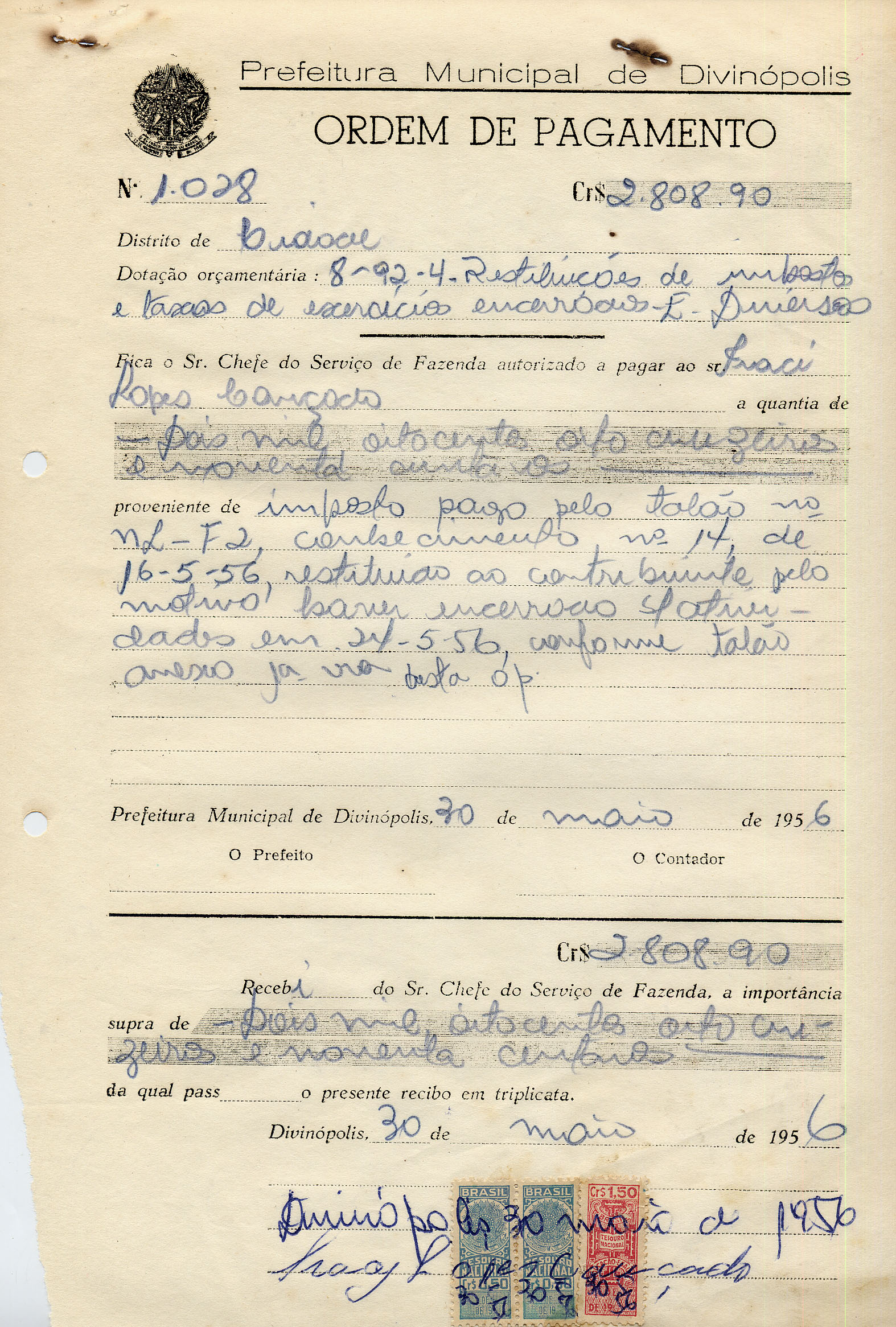RECEB DO SR. CHEFE DO SERVIÇO DE FAZENDA, A IMPORTÂNCIA SUPRA DE DA QUAL PASSO O PRESENTE RECIBO EM TRIPLICATA.