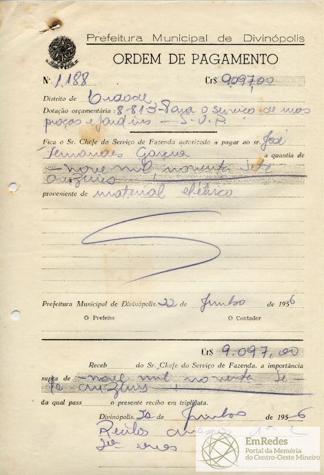RECEBI DO SR. CHEFE DO SERVIÇO DE FAZENDA, A IMPORTÂNCIA SUPRA DE NOVE MIL NOVENTA E SETE CRUZEIROS DA QUAL PASSO O PRESENTE RECIBO EM TRIPLICATA.