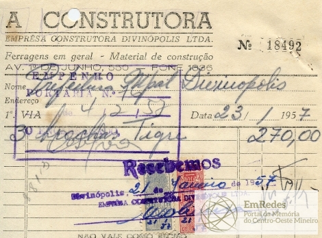 FICA O SR. CHEFE DO SERVIÇO DE FAZENDA AUTORIZADO A PAGAR AO SR. EMP. CONST. DIVINÓPOLIS LTDA, A QUANTIA DE DUZENTOS E SETENTA CRUZEIROS PROVENIENTE DE MATERIAL FORNEICO NOTA 18492.