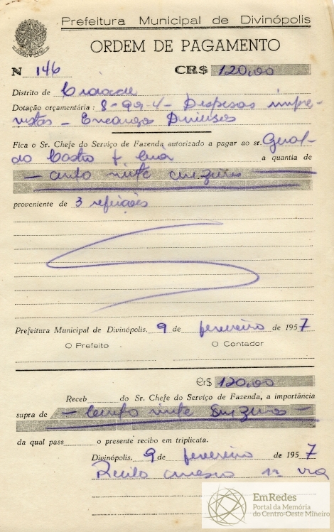 RECEBI DO SR. CHEFE DO SERVIÇO DE FAZENDA, A IMPORTÂNCIA SUPRA DE CENTO E VINTE CRUZEIROS QUAL PASSO O PRESENTE RECIBO EM TRIPLICATA.