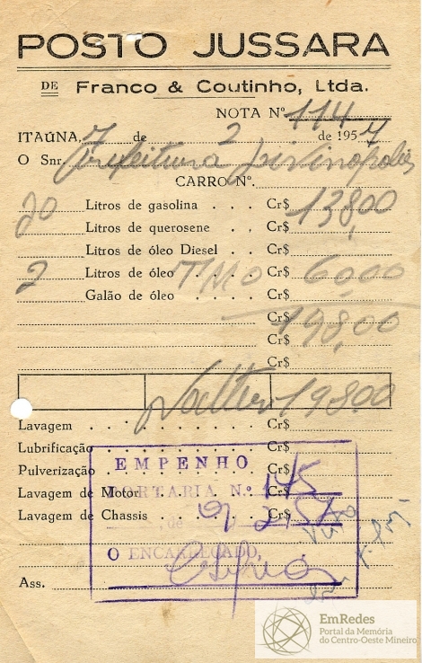 PREFEITURA MUNICIPAL DE DIVINÓPOLIS - ORDEM DE PAGAMENTO Nº 145 CR$ 198,00 DISTRITO DE CIDADE DOTAÇÃO ORÇAMENTÁRIA 8-82-3 COMBUSTÍVEIS E LUBRIFICANTES FICA O SR. CHEFE DO SERVIÇO DE FAZENDA AUTORIZADO A PAGAR AO SR. FRANCO E COUTINHO LTDA, A QUANTIA DE CENTO E NOVENTA OITO CRUZEIROS PROVENIENTE DE GASOLINA E ÓLEO. PREFEITURA MUNICIPAL DE DIVINÓPOLIS, 09 DE FEVEREIRO DE 1957 CR$ 198,00 RECEBI DO SR. CHEFE DO SERVIÇO DE FAZENDA, A IMPORTÂNCIA SUPRA DE CENTO E NOVENTA OITO CRUZEIROS QUAL PASSO O PRESENTE RECIBO EM TRIPLICATA. DIVINÓPOLIS, 09 DE FEVEREIRO DE 1957