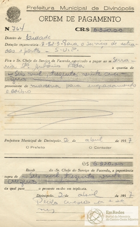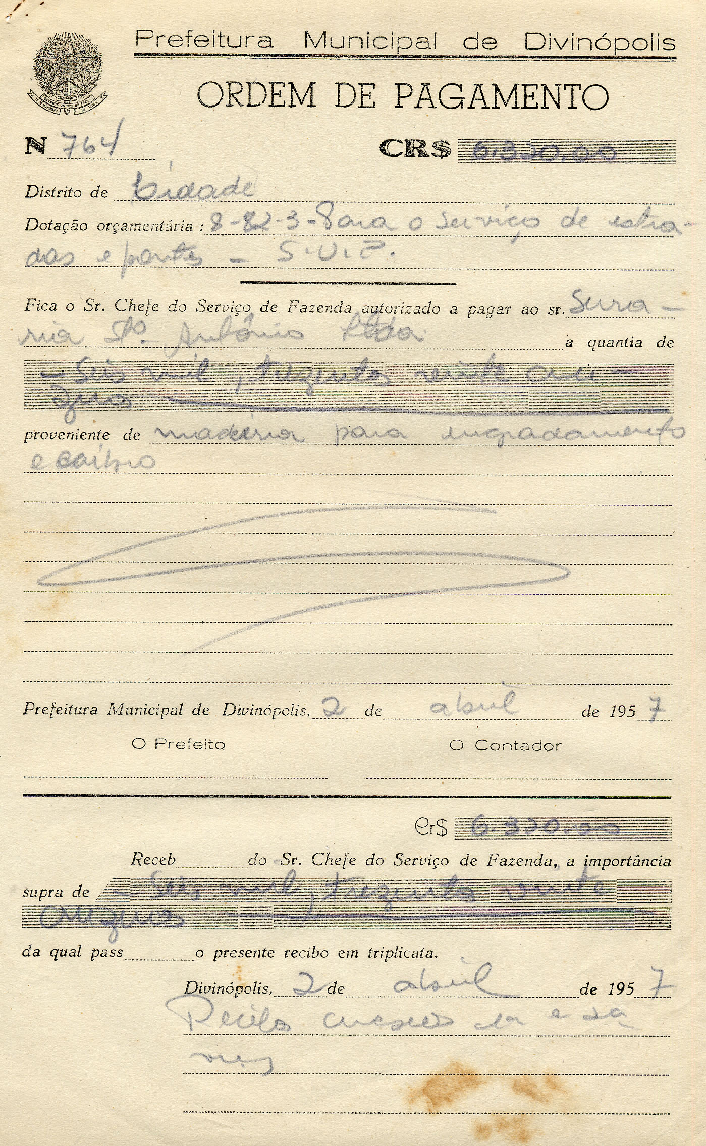 RECEBI DO SR. CHEFE DO SERVIÇO DE FAZENDA, A IMPORTÂNCIA SUPRA DE SEIS MIL TREZENTOS E VINTE CRUZEIROS QUAL PASSO O PRESENTE RECIBO EM TRIPLICATA.