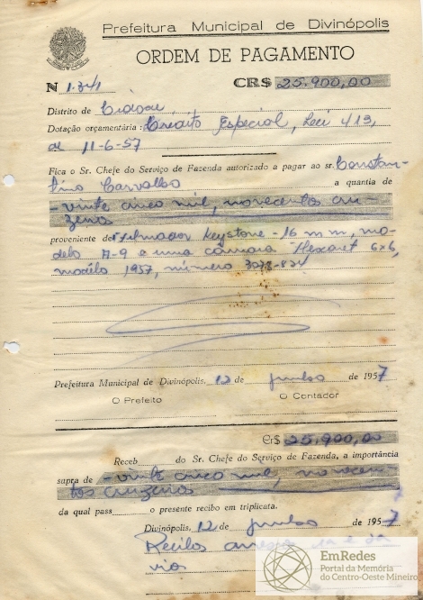 RECEBI DO SR. CHEFE DO SERVIÇO DE FAZENDA, A IMPORTÂNCIA SUPRA DE VINTE E CINCO MIL E NOVECENTOS CRUZEIROS DA QUAL PASSO O PRESENTE RECIBO EM TRIPLICATA.