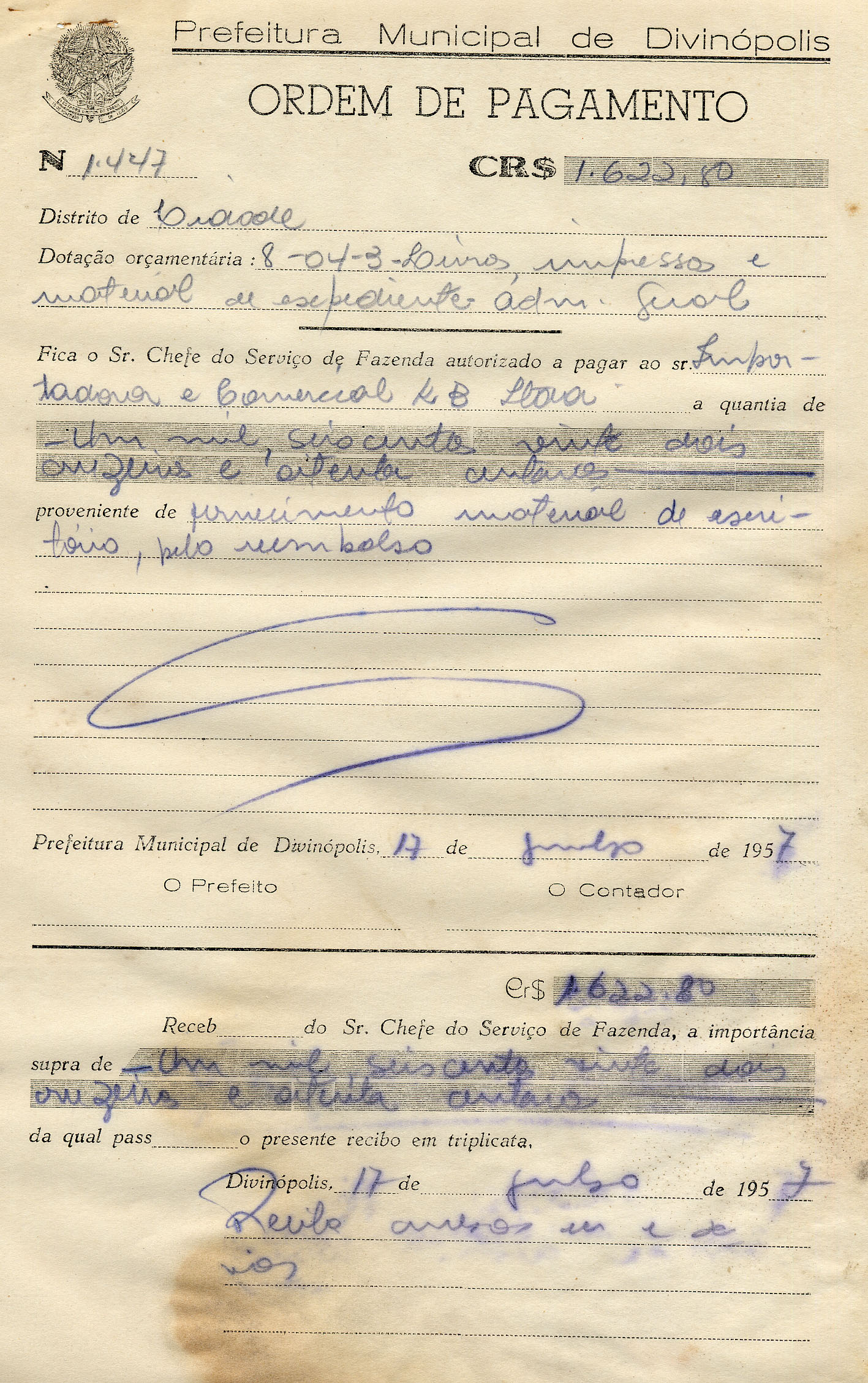 RECEBI DO SR. CHEFE DO SERVIÇO DE FAZENDA, A IMPORTÂNCIA SUPRA DE UM MIL SEISCENTOS E VINTE DOIS CRUZEIROS E OITENTA CENTAVOS DA QUAL PASSO O PRESENTE RECIBO EM TRIPLICATA.