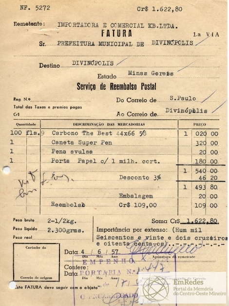 FICA O SR. CHEFE DO SERVIÇO DE FAZENDA AUTORIZADO A PAGAR AO SR. IMPORTADORA E COMERCIAL KB LTDA, A QUANTIA DE UM MIL SEISCENTOS E VINTE DOIS CRUZEIROS E OITENTA CENTAVOS PROVENIENTE DE FORNECIMENTO DE MSTERIAL DE ESCRITÓRIO PELO REEMBOLSO.
